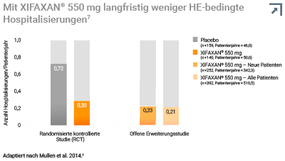 Auch in einer Langzeitstudie mit XIFAXAN® 550 mg wurde eine Reduktion der Rate der HE-bedingten Hospitalisierungen sowie der Hospitalisierungen insgesamt gezeigt, ohne dass sich dabei die Rate unerwünschter Ereignisse erhöhte. Zum Vergleich der Langzeitwirkung wurden die Werte der Patienten aus der 6-monatigen randomisierten Kontrollstudie herangezogen.7,#